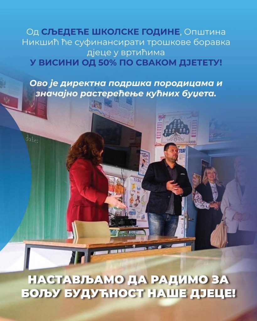 Od sljedeće školske godine, Opština Nikšić će sufinansirati troškove boravka djece u vrtićima u visini od 50% po svakom djetetu.